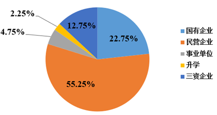 2022年硕士研究生毕业为40人,其中8人进入国有企业占毕业总人数的22.75%,22人进入民营企业,7人进入三资企业,分别占毕业总人数的55.25%和12.75%,1人进入高校继续深造,2人进入进入事业单位,分别占毕业总人数的2.25%和4.75%。具体情况如下: