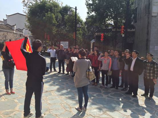首先,党员们佩戴党徽,坚定地举起右拳,在新四军第五师司政机关大礼堂旧址前,重温入党誓词。
