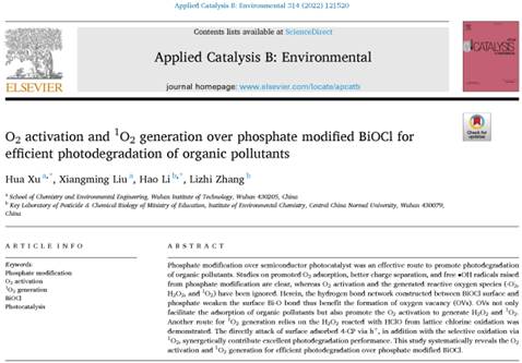 (通讯员程然)近期,环境科学领域国际权威期刊AppliedCatalysis B : Environmental (IF=19.503)在线发表了公司伟德国际1949官网许华老师的研究论文“O2activation and1O2generation over phosphate modifiedBiOCl for efficient photodegradation of organic pollutants (Applied Catalysis B: Environmental 314(2022)121520)”(第一作者:许华,第二作者:硕士刘香铭)。