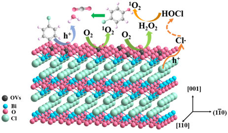 光催化技术可以利用太阳能降解/矿化有机污染物,是一种极具潜力的环境污染控制技术。通过对半导体光催化剂进行表面磷酸修饰,不仅可以在其表面形成负电场有利于分子氧(O2)的吸附和光生载流子(e-- h+)的分离,而且表面氢键的构建有利于水分子(H2O)的活化形成更多的游离羟基自由基(∙OH)作为活性氧物种;但是通过分子氧活化生成其他活性氧物种(如超氧负离子·O2-,双氧水H2O2,单线态氧1O2)的机制研究缺鲜见报道。在本工作中,作者系统研究了磷酸修饰氯氧铋(P-BiOCl)光催化反应体系中分子氧活化、1O2形成机制及氯酚类有机污染物降解路径等之间的构效关系。该研究深入揭示了BiOCl光催化反应体系中潜在的晶格Cl-氧化所引起的单线态氧1O2生成机制,为全面研究分子氧活化及单线态氧1O2生成机制提供了有益借鉴。