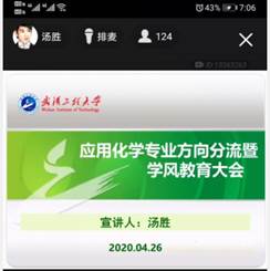(通讯员 殷正霞)为保障疫情期间2018级应用化学、环境工程两个专业的方向分流工作顺利进行,学院通过线上组织召开了方向分流宣讲会。4月26日,学院分党委书记郭昕、经理余军霞、副经理王营茹、应用化学教研室主任高洪、专业负责人陈嵘教授、环境工程与环境监察教研室主任关洪亮、副主任张华丽、2018级辅导员杨娟以及全体专业课教师和2018级全体同学参加了此次宣讲会。