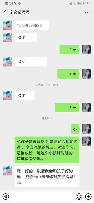 每隔两天我就会通过微信告知芊芊妈妈孩子目前的学习情况,让她能够安心。在与小孩交流和引导小孩学习方面,我也会给给芊芊妈妈提供了一些自己的看法和意见,希望她们母女能相处得更好。