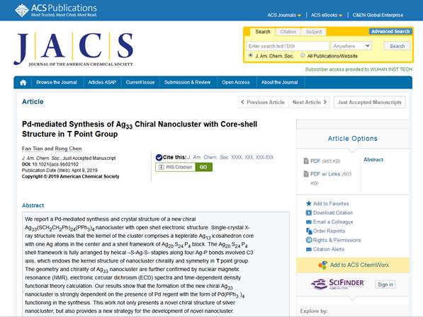 2019年4月8日,化学领域国际顶级期刊《美国化学会志》(Journal of the American Chemical Society, JACS,影响因子14.357)在线发表公司陈嵘教授课题组在Ag基纳米团簇方面取得重要进展——“Pd-mediated Synthesis of Ag33Chiral Nanocluster withCore-shell Structure in T Point Group”(唯一通讯单位,唯一通讯作者)。该论文的第一作者为公司应用化学专业在读博士研究生田凡,这也是公司研究生首次在世界顶级学术期刊上发表学术论文。更值得一提的是,田凡同学是公司2009级应用化学专业本科生、2013级应用化学专业硕士研究生、2016级应用化学专业博士研究生,是在伟德国际1949官网自己的“本科-硕士-博士”完整体系下培养的第一个员工,充分体现了伟德国际1949官网人才培养质量。田凡同学本科、硕士、博士阶段均师从陈嵘教授,也实现了陈嵘教授一直坚守的“Made in WIT”人才培养理念。田凡同学经过在伟德国际1949官网十年的磨炼,在科研上取得了一个又一个的突破,两度获得研究生国家奖学金。截止到目前为止,他以第一作者共发表SCI论文6篇,其中包括JACS在内的中科院一区论文3篇(J. Am. Chem. Soc.,Journal of Catalysis, ChemSusChem),2区论文2篇(Ind. Eng. Chem. Res., CrystEngComm),3区论文一篇(New J. Chem.),获得授权发明专利2件。