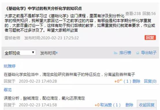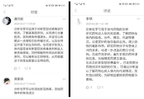 精巧设计,课程思政魅力精彩纷呈。“这次疫情,给你带来了哪些影响和改变?”“咱们的分析化学知识在疫情病毒检测中发挥了什么作用?”学院课程团队积极探索线上教学技术手段的同时,创新“虚拟”课堂教学新模式,将线上教学赋予课程价值引领功能,不断拓展和创新课程思政新路径。喻德忠教授在线上讲授绪论时,结合新冠肺炎疫情,讨论了分析化学在药物及病毒检测中的应用,并安排员工查阅相关资料,了解相关知识。郑石老师在线上教学平台发布了“分析化学在生产生活中有哪些应用?”大讨论,员工们在讨论中不知不觉的联系到当前疫情,就分析化学如何解决实际问题,特别是对于疫情控制的作用展开讨论,同时延伸到药物分析等方向。学院老师们精心将专业课程与疫情热点问题相结合,引导同学们学会思考、学会关注、学会将自己所学专业知识与理想信念紧密结合。