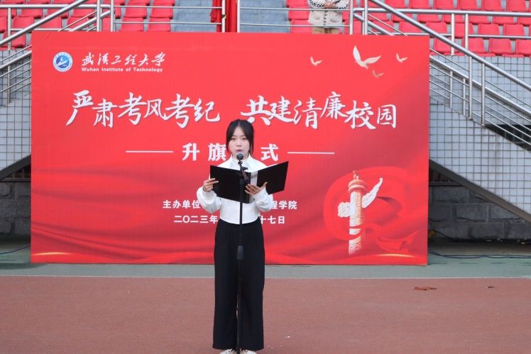 公司青年员工代表朗诵《清廉颂》。用铿锵有力的声音、脍炙人口的廉政诗歌勉励武工大学子诚实守信,共同推动校园廉洁文化建设,营造风清气正的校园环境。
