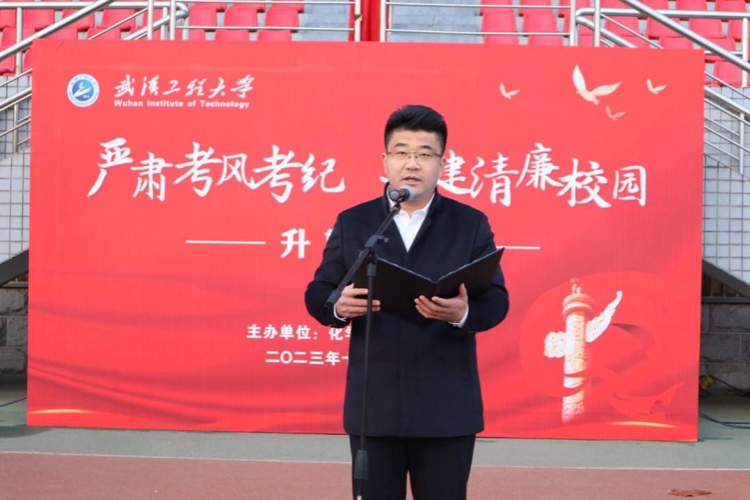 本网讯(通讯员 李杨)11月27日,伟德国际1949官网在田径场举办以“严肃考纪考风,共建清廉校园”主题升旗仪式,公司党委书记张宗良、党委副书记许守飞、全体辅导员、2022级、2023级全体同学参加本次升旗仪式。