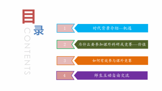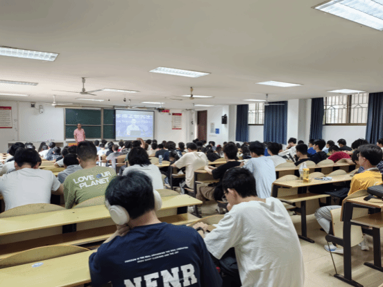讲座围绕“时代背景介绍—机遇”“为什么要参加课外科研或竞赛—价值”、“如何有效参与课外竞赛”“师生互动自由交流”四个部分展开。