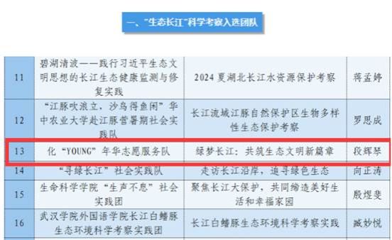 据了解,化“YOUNG”年华志愿服务队已连续两年入选全国“美丽中国·青春行动”青年绿色长征科考实践活动专项团队。并在全国1071支实践团优秀成果评选中脱颖而出,荣获了“美丽中国 青春行动”2023年青少年绿色长征科考实践“优秀实践成果”奖(23/1071),创历史新高。