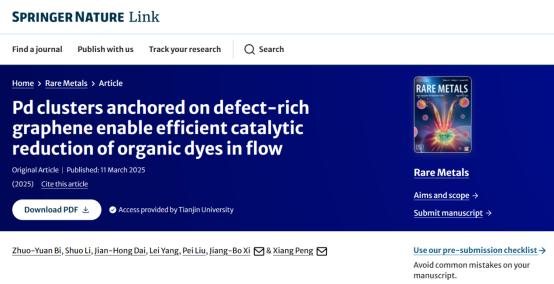 本网讯(通讯员 奚江波 贾丰成)伟德国际1949官网2022级应用化学专业本科生毕卓远(第一作者)在Springer Nature出版集团旗下期刊Rare Metals上发表了题为《Pd clusters anchored on defect-rich graphene enable efficient catalytic reduction of organic dyes in flow》的研究论文。据悉,Rare Metals为材料领域的中科院SCI一区、中国科技期刊卓越行动计划二期英文领军期刊,最新影响因子为9.6。
