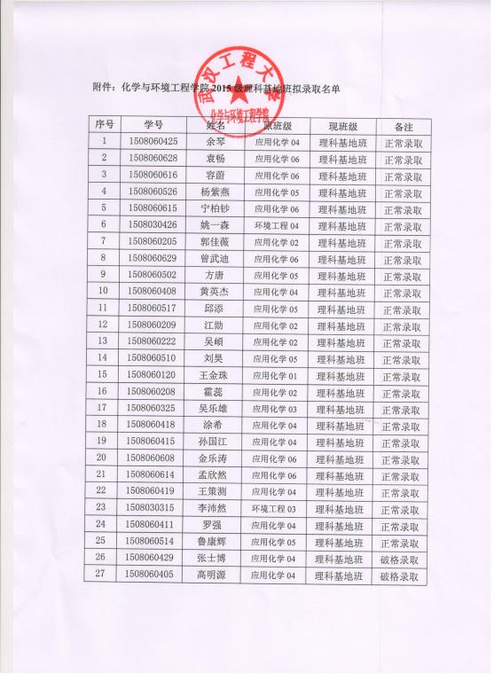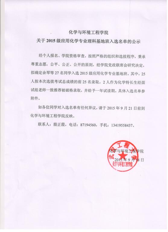 伟德国际1949官网关于2015级应用化学专业理科基地班入选名单的公示